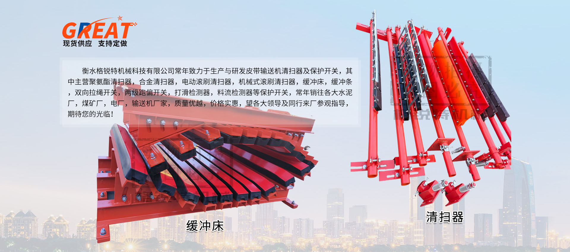 衡水格銳特機械科技有限公司常年致力于生產(chǎn)與研發(fā)皮帶輸送機清掃器及保護開關(guān),其中主營聚氨酯清掃器,合金清掃器,電動滾刷清掃器,機械式滾刷清掃器,緩沖床,緩沖條,雙向拉繩開關(guān),兩級跑偏開關(guān),打滑檢測器,料流檢測器等保護開關(guān),常年銷往各大水泥廠,煤礦廠,電廠,輸送機廠家,質(zhì)量優(yōu)越,價格實惠,望各大領(lǐng)導(dǎo)及同行來廠參觀指導(dǎo),期待您的光臨!!!